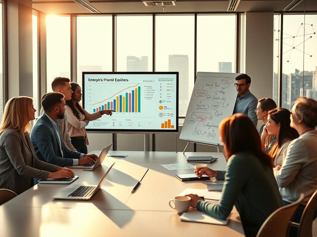 reunion en oficina moderna con luz natural profesionales y graficos coloridos