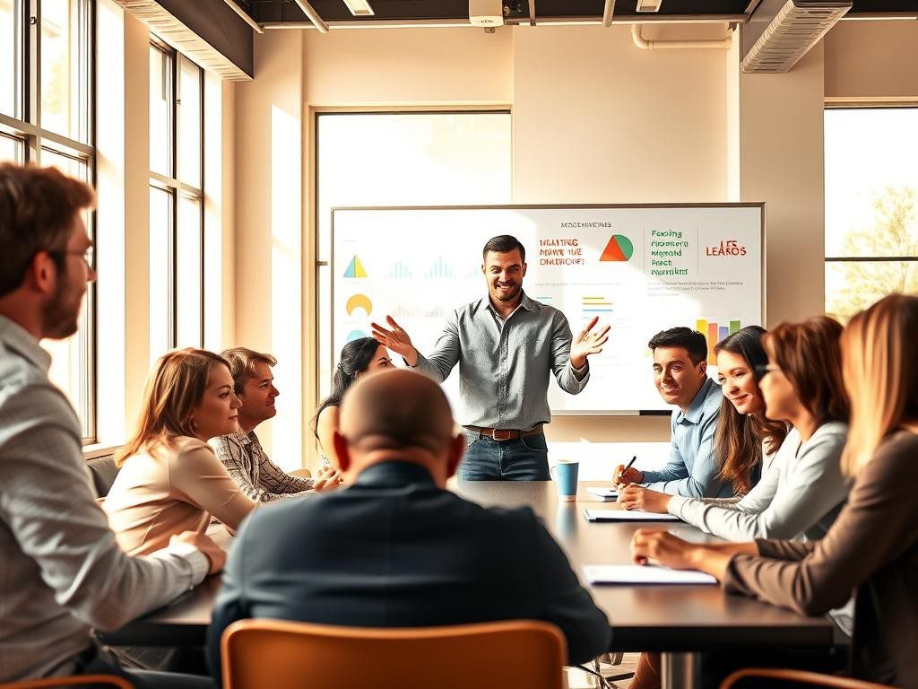reunion vibrante en oficina luminosa con lider inspirador y equipo unido