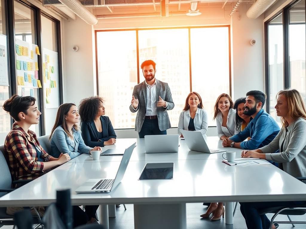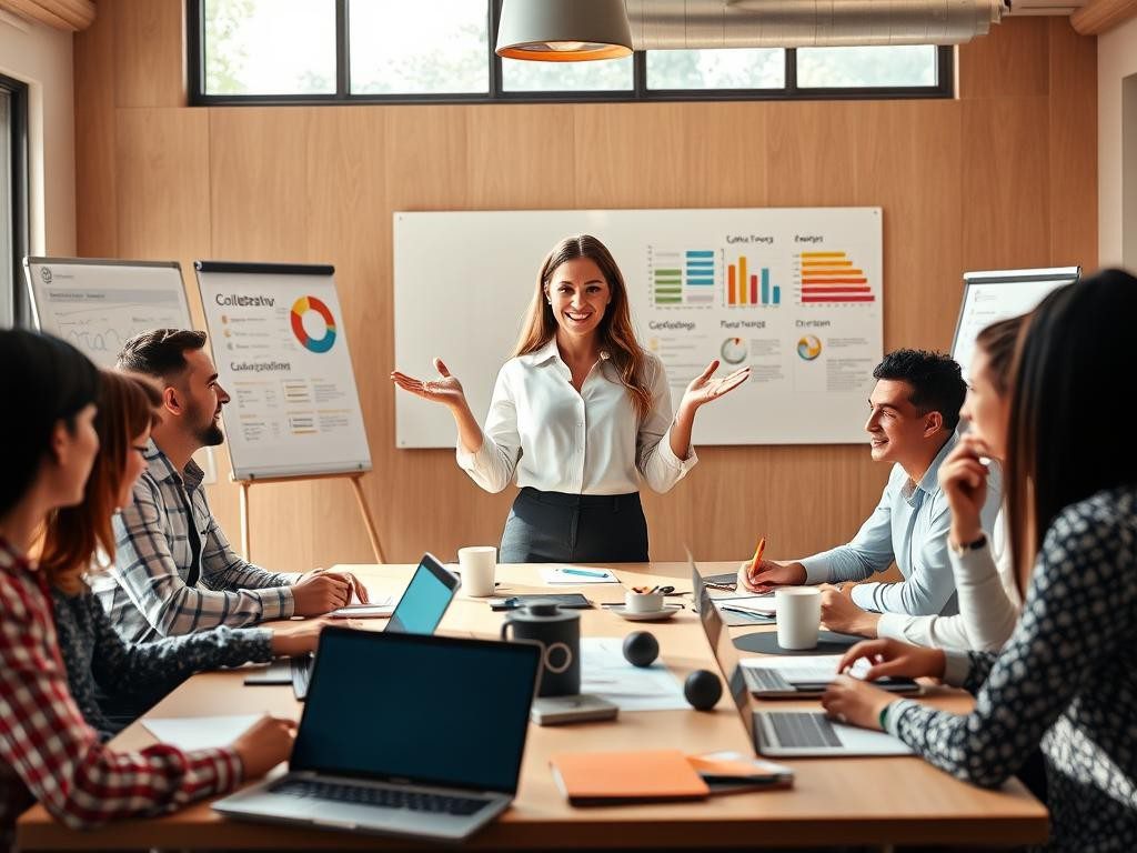 lider segura y entusiasta en sala moderna rodeada de equipo atento y colaborativo